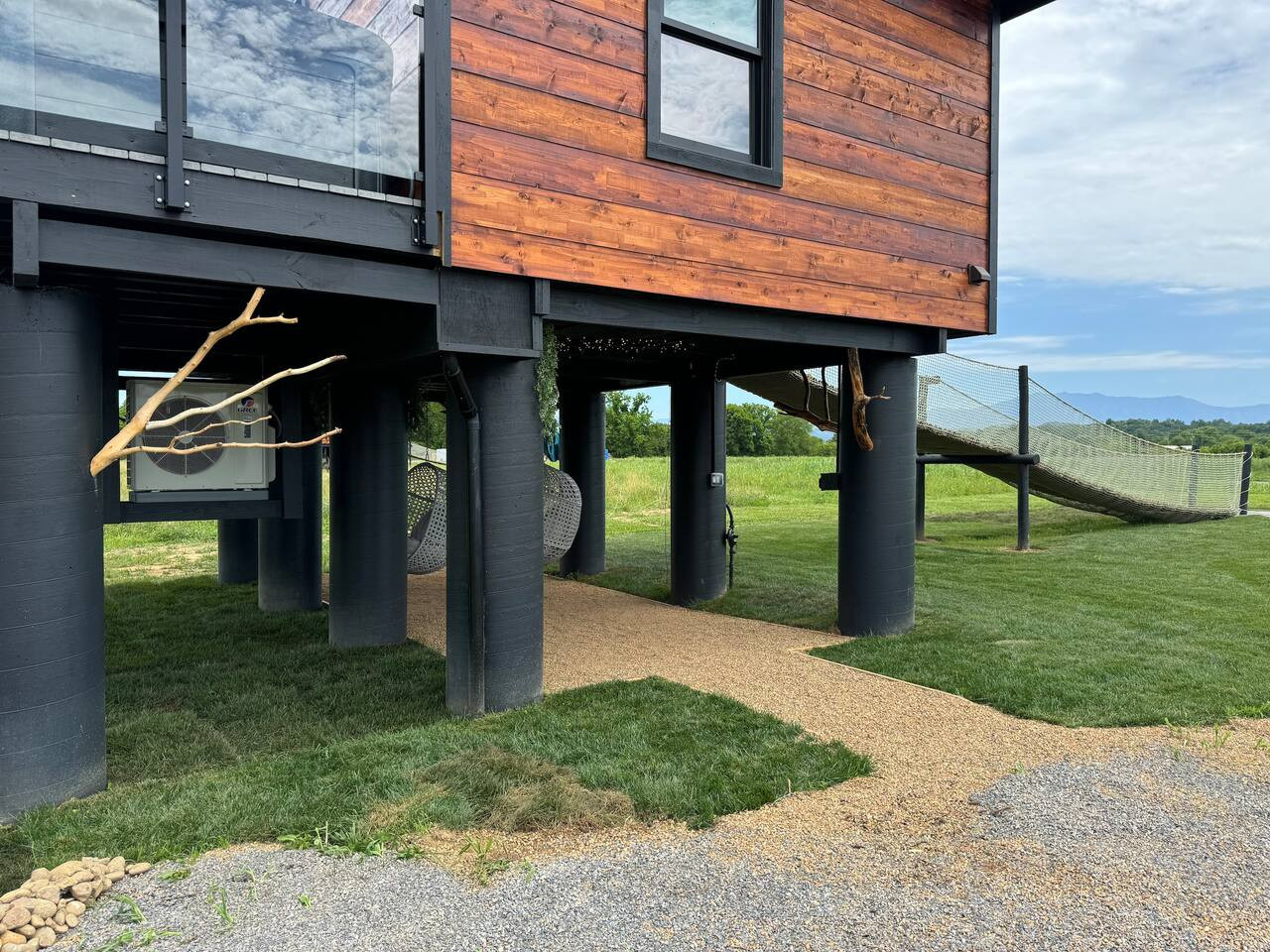 / nightIf you loved the movie Forrest Gump, you will love this treehouse. Modern, romantic, comfortable and peaceful in middle of 57 acre farm with 1/2 mile of river frontage in downtown Sevierville. Through the tree gate, you will wind along the road to your "treehouse". Your luxurious trip awaits you @ the top of the log rope bridge w/ 23 movie references. Can you find them all? On the deck is your hot tub, gas firepit, Adirondack rocking chairs, & bistro table. Egg chairs underneath to enjoy. The treehouse is in the middle of a 57 acre farm looking out over the field towards the Little Pigeon River from the deck and the front faces the Great Smoky Mountains with views of Mt Leconte and the peaks which the Appalachian Trail traverses. There are two beach chairs underneath that you can take down to “The Island” at the river to dip your toes in the water and relax. There are two tubes underneath as well that you can take down to the river and walk up and float down. Chocos or water shoes recommend.