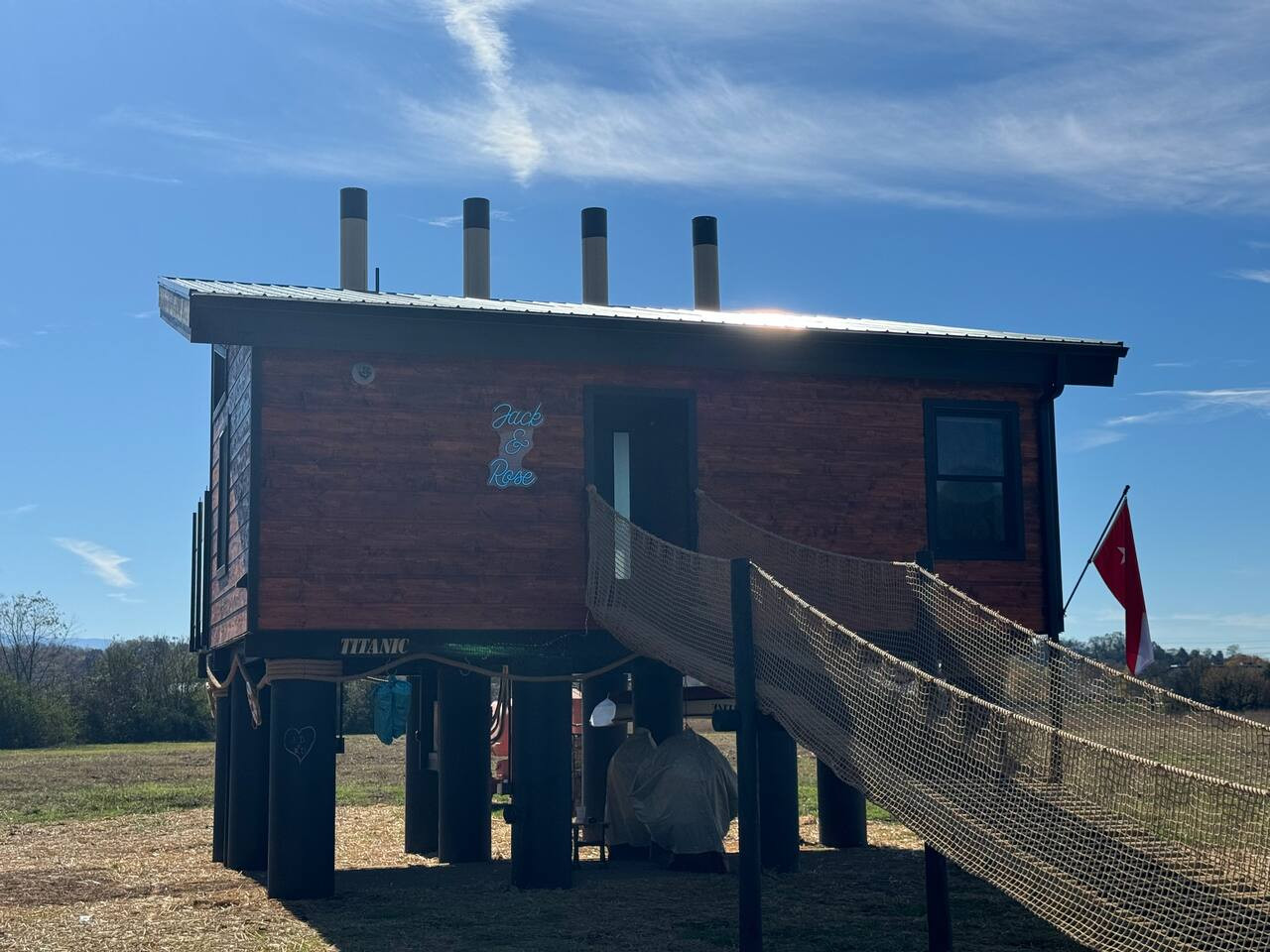 / nightYour adventure aboard your very own "Ship of Dreams" awaits you at the top of the gang plank. Loaded with images and decor from the movie and ship. Located on 57 acre farm in downtown Sevierville with over 1/2 mile of frontage on the West Fork of the Little Pigeon River. Beach chairs (and tubes during summer) provided to walk down path to "the island" to enjoy the river. We enjoy our privacy and have spaced the five treehouses well away from each other so you can too. #titanicmuseum #titanicmovie #titanic #jackandrose